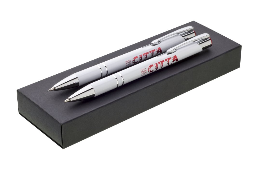 Sada kovové hliníkové propisky a mikrotužky s bílým povrchem a barevným lesklým laserem v barvě horního ukončení propisky. Tělo zdobené dvěma stříbrnými proužky. Sada je nabízena v černé papírové krabičce PORE.
