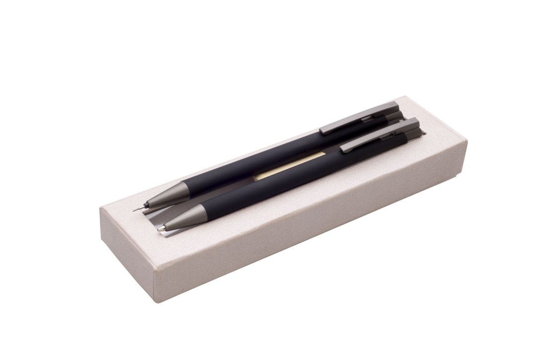 Dárková sada černé propisky a mikrotužky s pogumovaným povrchem a šedými doplňky v luxusním dárkovém pouzdru s průhledným okénkem.