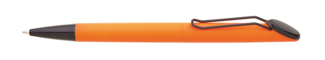 Plastová otočná propiska ARESTA v neonově oranžové barvě s černou špičkou a černým kovovým klipem. Na držák klipu je možné umístit epoxy samolepku. Náplň velkoobsahová, modře píšící.