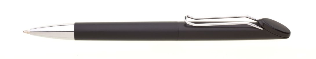 Propiska LINEA černá má zajímavě řešený klip a stříbrné doplňky, modře píšící náplň. Kolekce DESIGN.